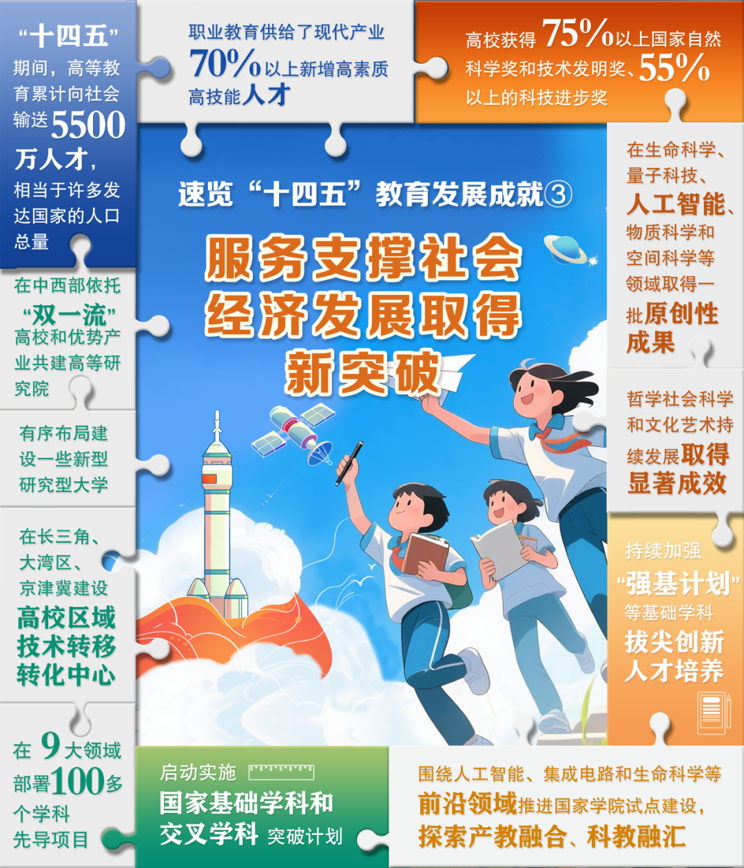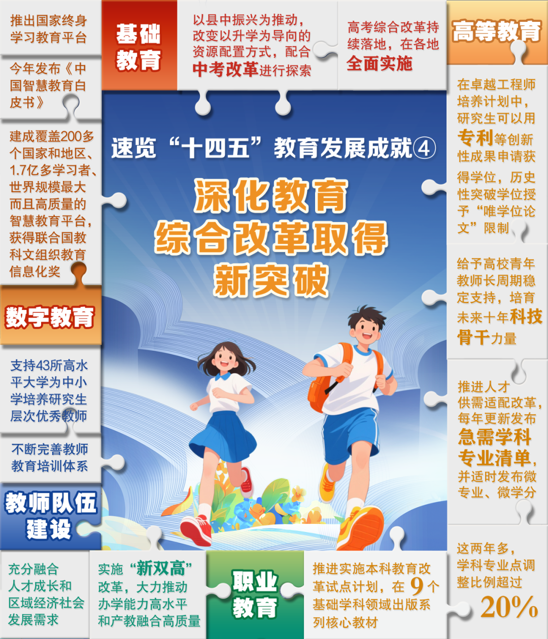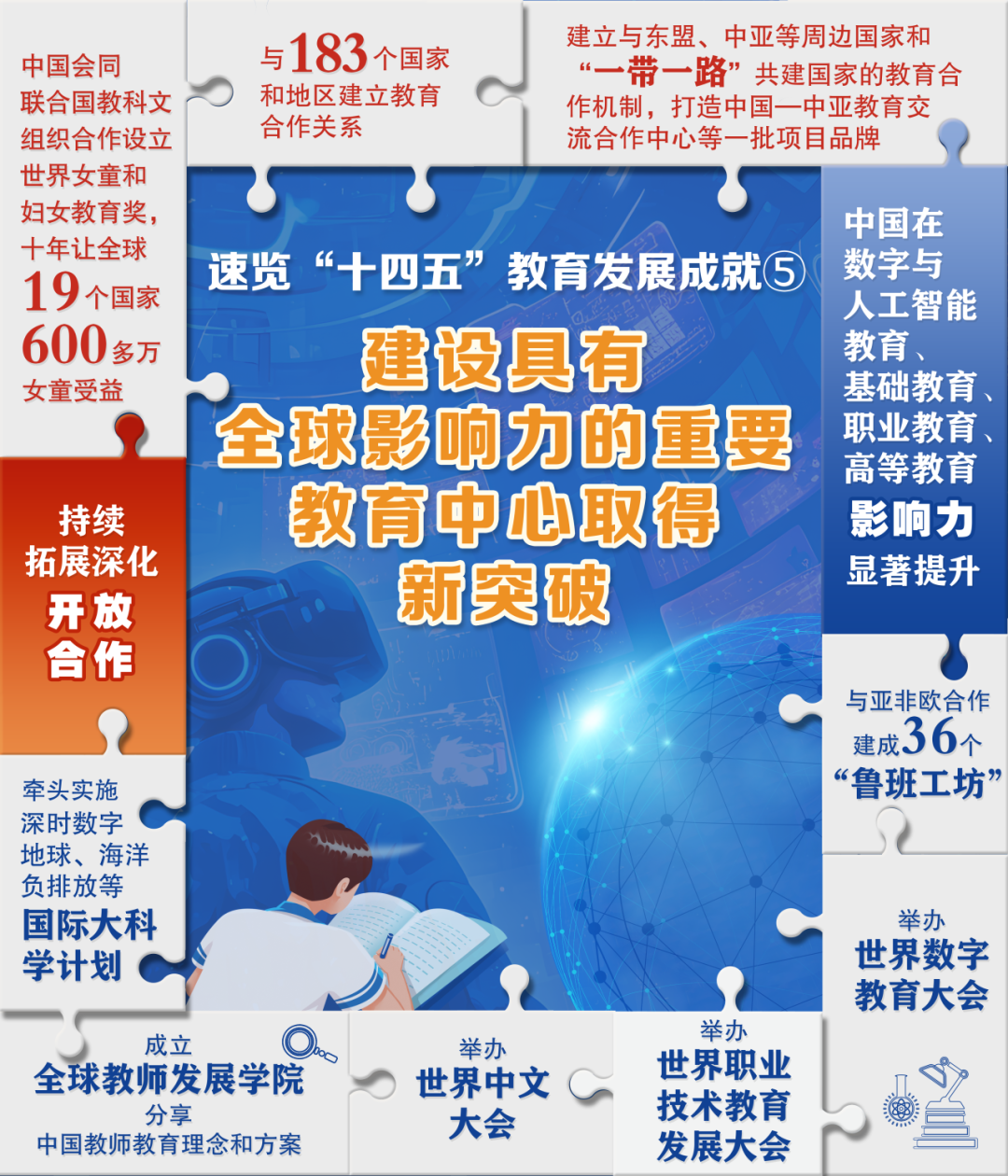 在9月23日举行的国新办新闻发布会上,教育部部长怀进鹏表示,“十四五”时期,在党中央、国务院的坚强领导下,在全社会大力支持下,规划所确立的各项目标任务已全面高质量完成。跟随一组拼图,一起感受“十四五”教育发展成就。看向前程,锚定十年目标,一起“拼”出教育强国美好未来——