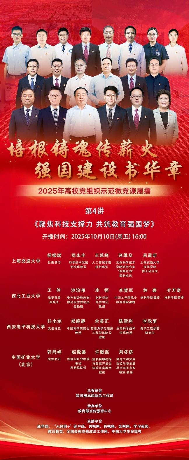 培根铸魂传薪火,强国建设书华章。10月10日(周五)16:00,跟随上海交通大学、西北工业大学、西安电子科技大学、中国矿业大学(北京)师生党员,走进2025年高校党组织示范微党课第4讲《聚焦科技支撑力 共筑教育强国梦》。关注微言教育微信,通过微言教育视频号、微博等平台收看直播——