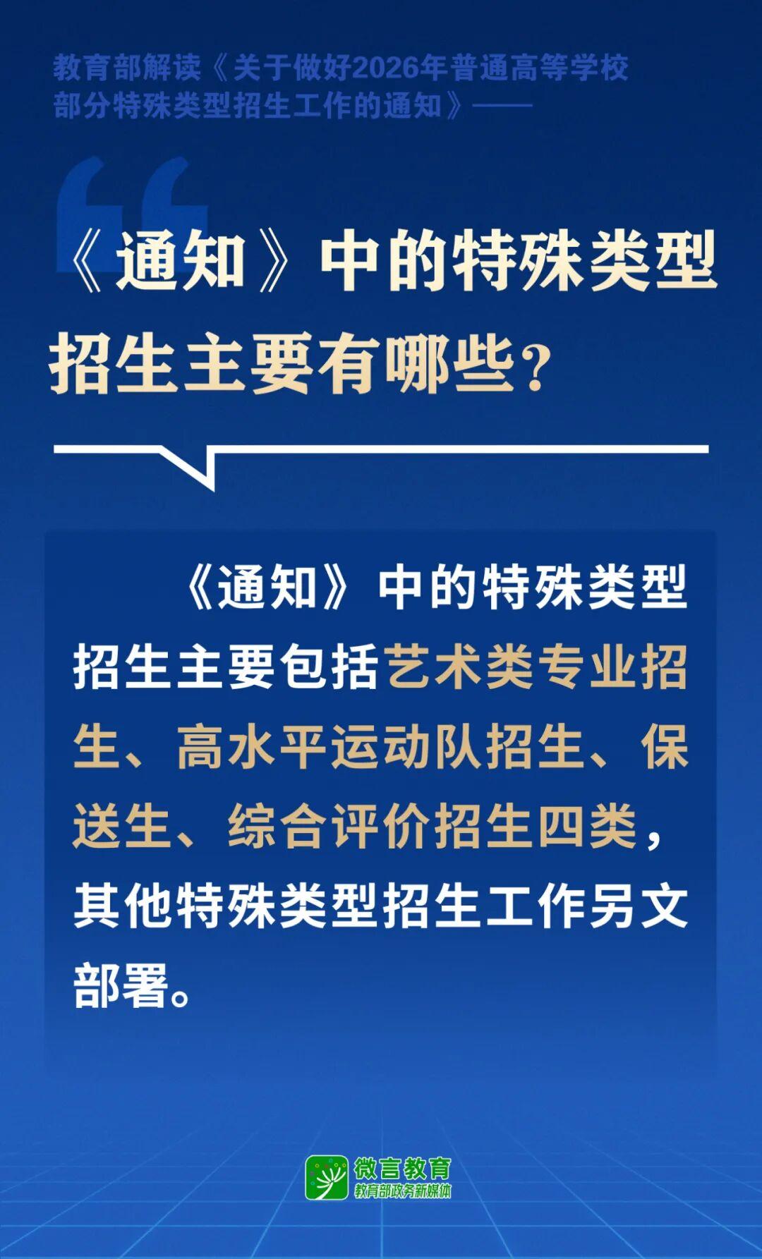 日前,教育部印发《关于做好2026年普通高等学校部分特殊类型招生工作的通知》(以下简称《通知》)。特殊类型招生主要有哪些?又有哪些新要求?