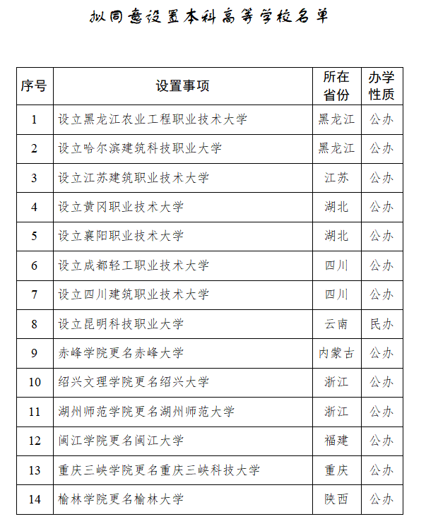 教育部公示 拟同意设置14所高校