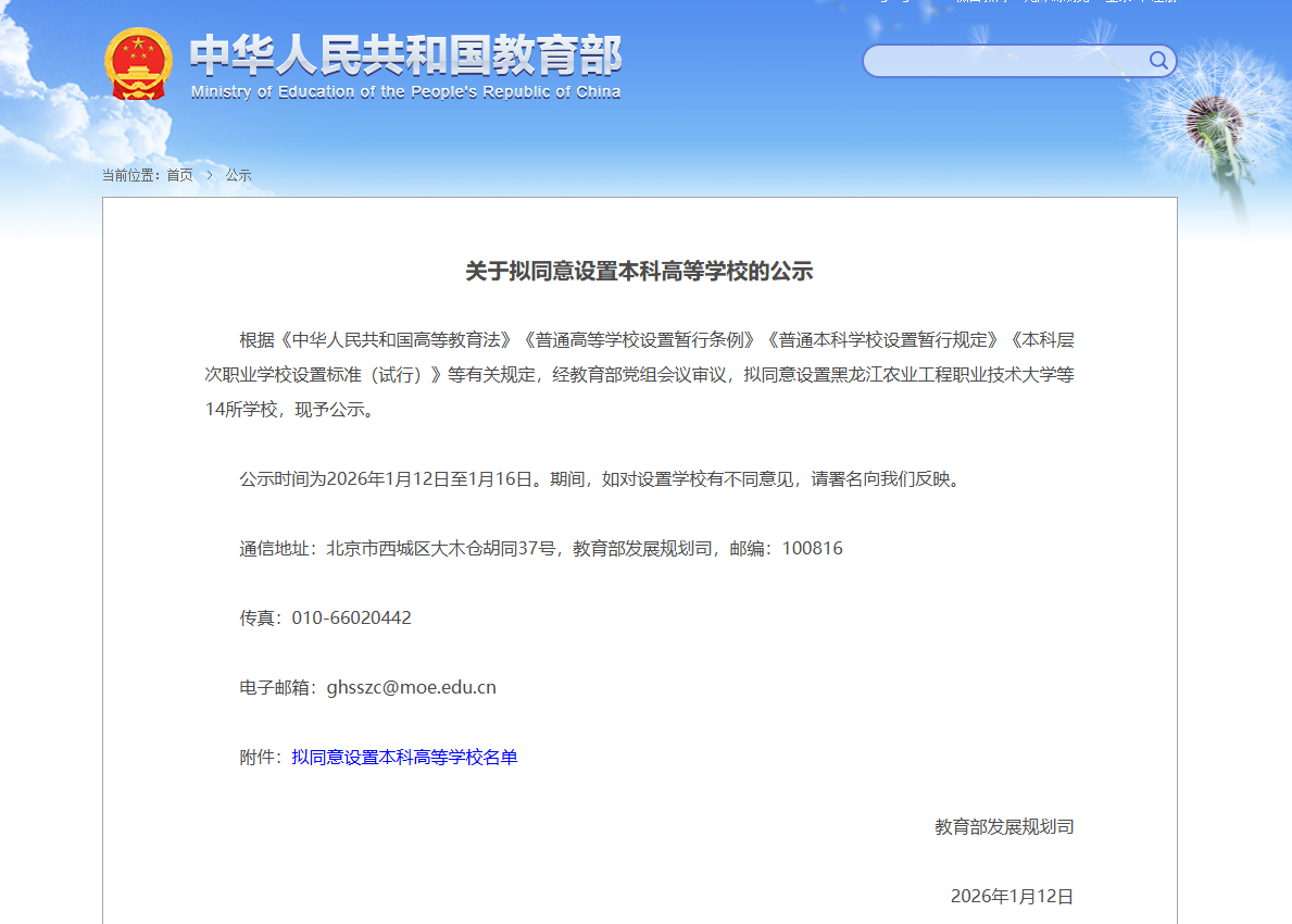 根据《中华人民共和国高等教育法》《普通高等学校设置暂行条例》《普通本科学校设置暂行规定》《本科层次职业学校设置标准(试行)》等有关规定,经教育部党组会议审议,拟同意设置黑龙江农业工程职业技术大学等14所学校,现予公示。公示时间为2026年1月12日至1月16日。