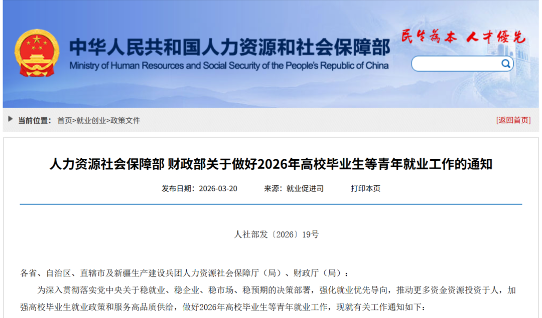 日前,人力资源社会保障部、财政部发布关于做好2026年高校毕业生等青年就业工作的通知。