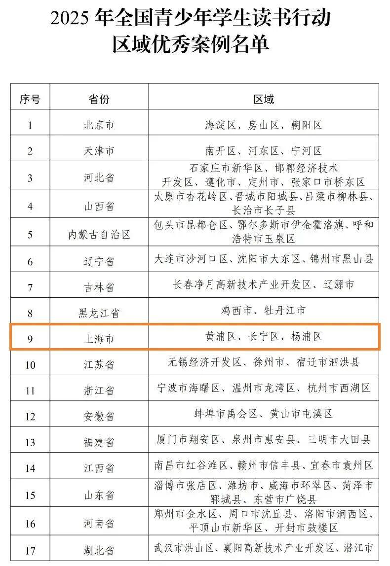 近日,教育部公布2025年全国青少年学生读书行动区域优秀案例名单。其中,上海市黄浦区、长宁区、杨浦区的案例榜上有名,一起来看——