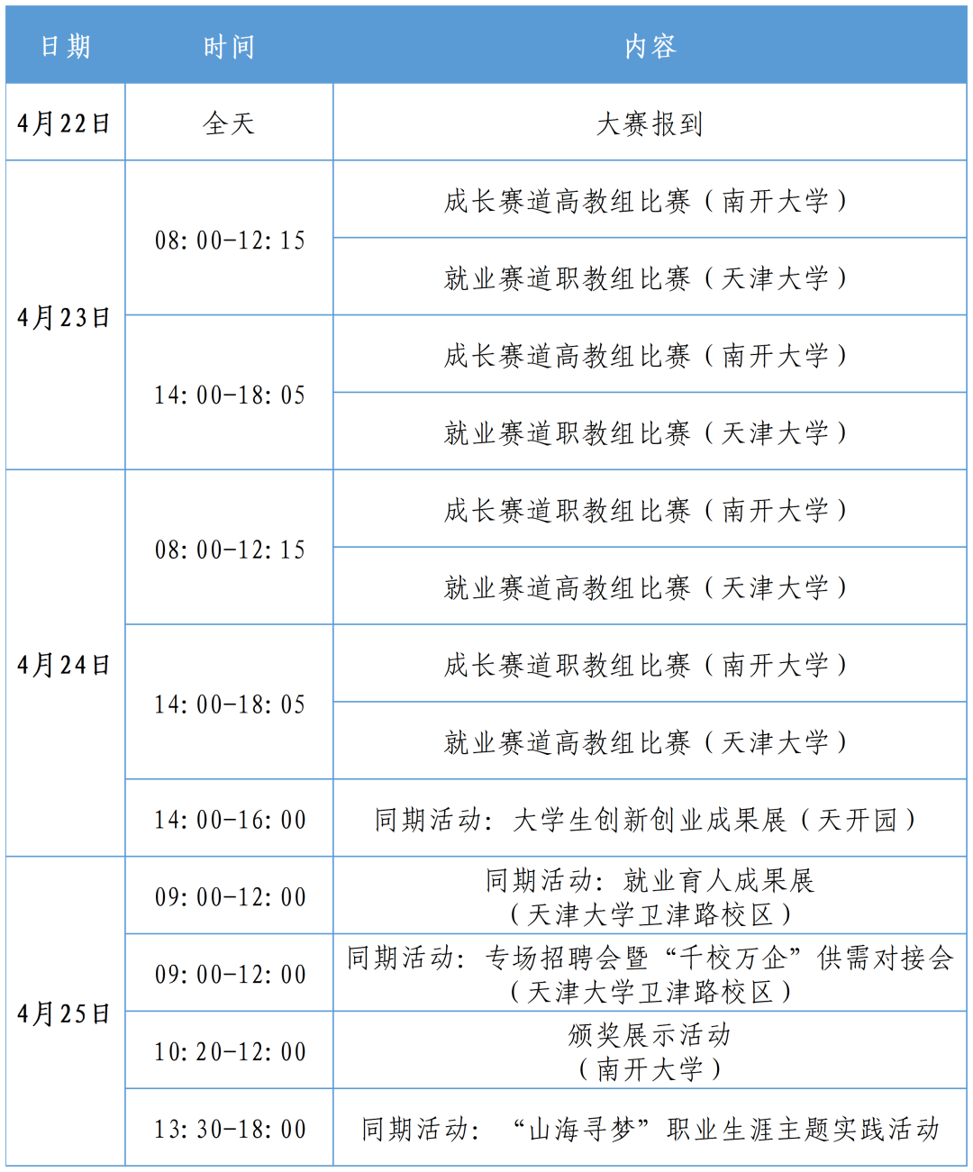 4月22日至25日,第三届全国大学生职业规划大赛全国总决赛将在天津举行。主体赛事及同期活动日程安排一起来看——