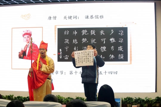 除了“直播带货”,这场新书发布会上,学生们还以小组的形式带来了《悟空涅槃记》,带领观众一起走进悟空的3段成长;在《书法绘西游》中,以书法的形式呈现了《西游记》中不同人物的特点和个性;在《看见西游美景》中,跟着文字重走西游路,实现一场说走就走的跨学科阅读之旅。
