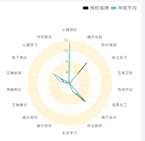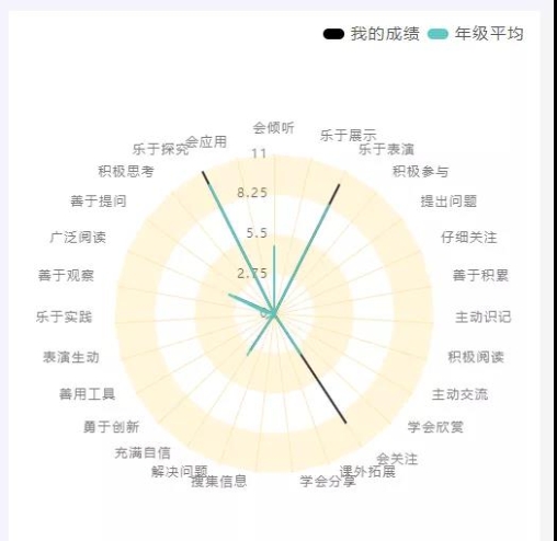 在中北一小,每个学生每一个学年结束都会收到自己的数字画像,并能收到一份基于“适性扬长”为导向的综合评价报告。在数字画像中,学生的个性特点可以通过雷达图得到清晰的呈现,尤其是学生在学习和能力发展上的优势会被肯定。记者看到,在学校某位一年级学生的综合评价中,乐于探究、乐于表演、会感受等方面被强调;在另一位同学的综合评价中,认真倾听、善于合作等方面则被强调。而类似这样细化的关注点多达几十项,将评价内容的多元表现地十分具体可感。