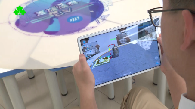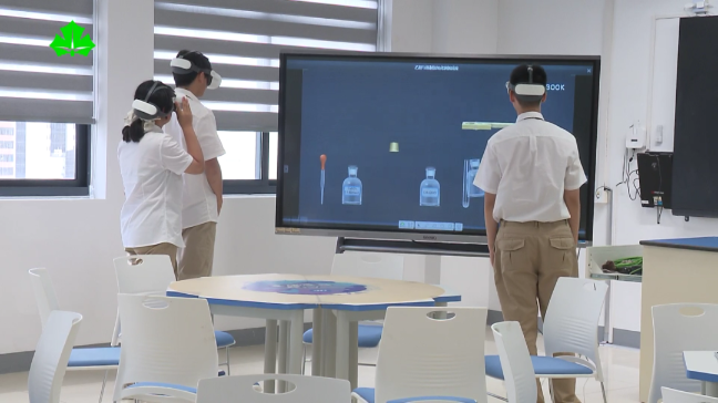 在实验室中,来自化学实验部落的同学们正在进行实验探究。借助学校化学教研组、科技公司和化工厂共同开发的课程资源包,同学们在VR眼镜和平板电脑的支持下,“走进”化工厂真实的工业生产场景,沉浸式了解实验现象和原理。