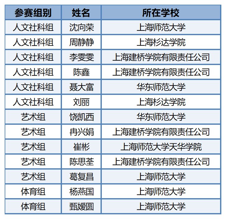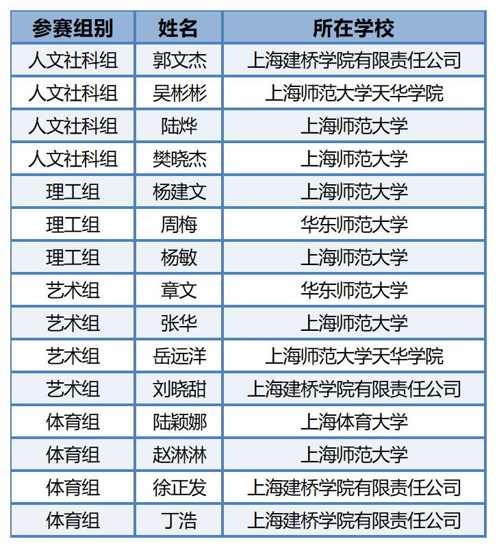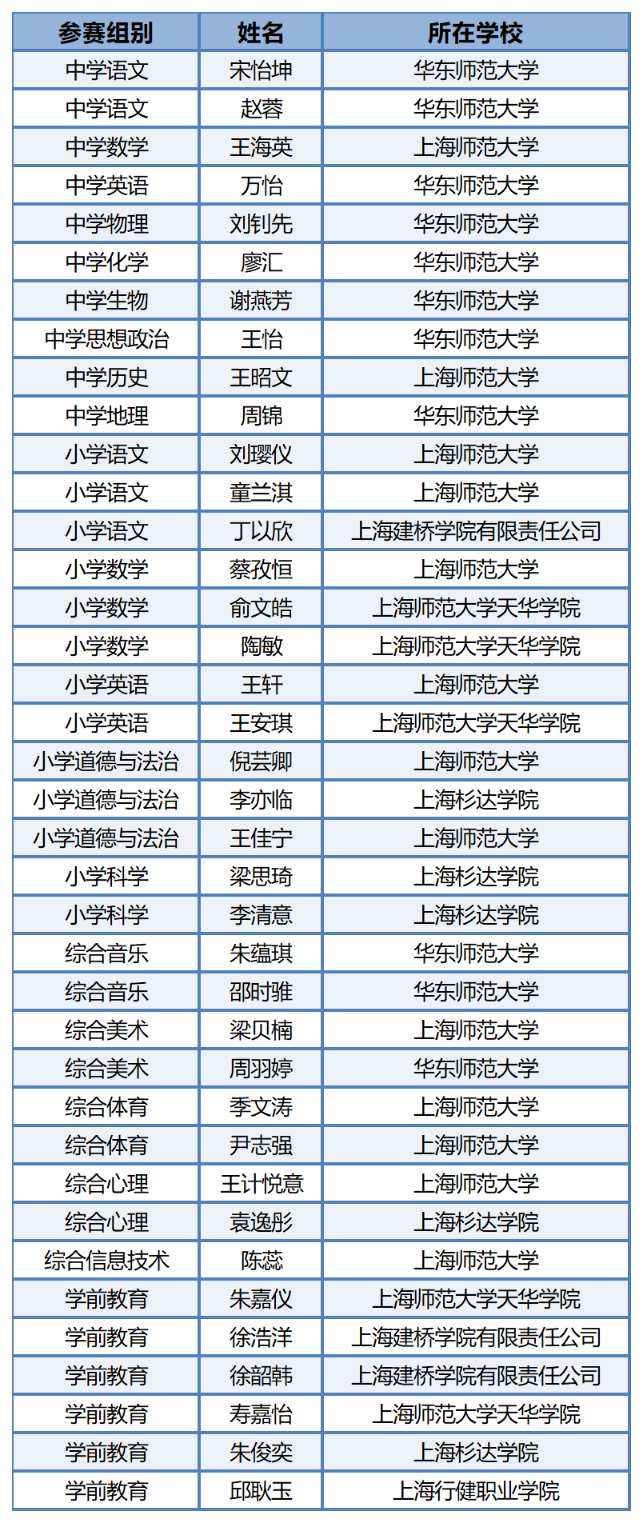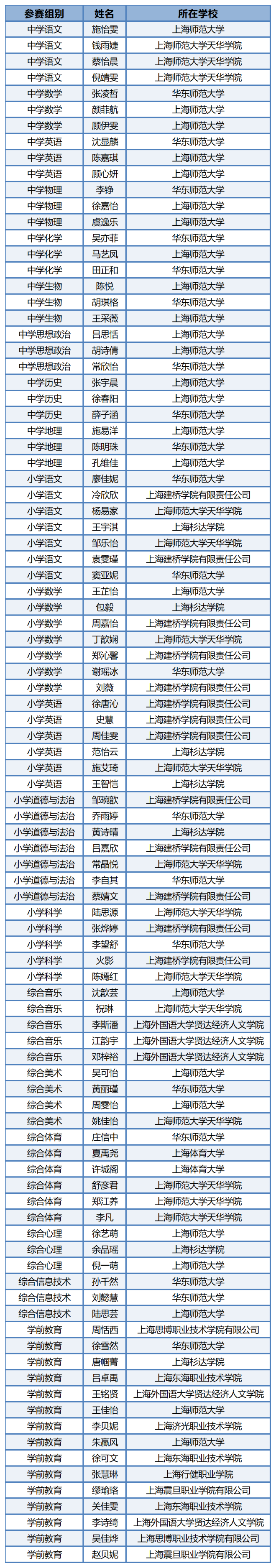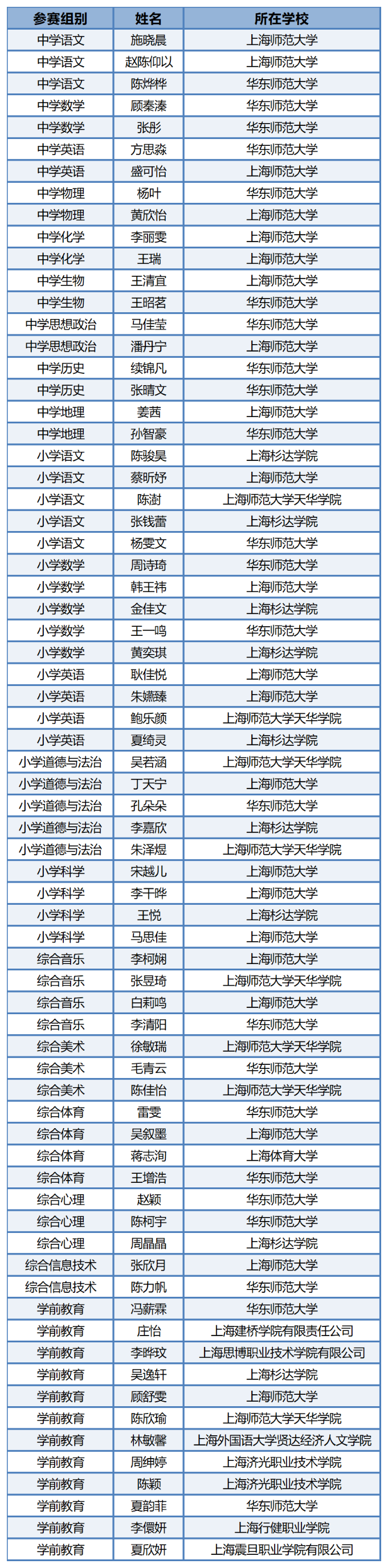 为贯彻落实《中共中央 国务院关于弘扬教育家精神加强新时代高素质专业化教师队伍建设的意见》和习近平总书记在扎实推进长三角一体化发展座谈会上的重要讲话精神,推动实施《新时代基础教育强师计划》,加快推动教师教育发展,根据相关文件,经校内初赛推荐和市级决赛,市教委确定华东师范大学宋怡坤等38人获第六届上海师范生教学基本功大赛一等奖,上海师范大学施晓晨等70人获二等奖,上海师范大学施怡雯等96人获三等奖;确定上海师范大学天华学院夏雪等8人获第六届上海师范院校教师智慧教学大赛一等奖,上海建桥学院有限责任公司郭文杰等15人获二等奖,上海师范大学沈向荣等13人获三等奖。一起来看获奖名单↓