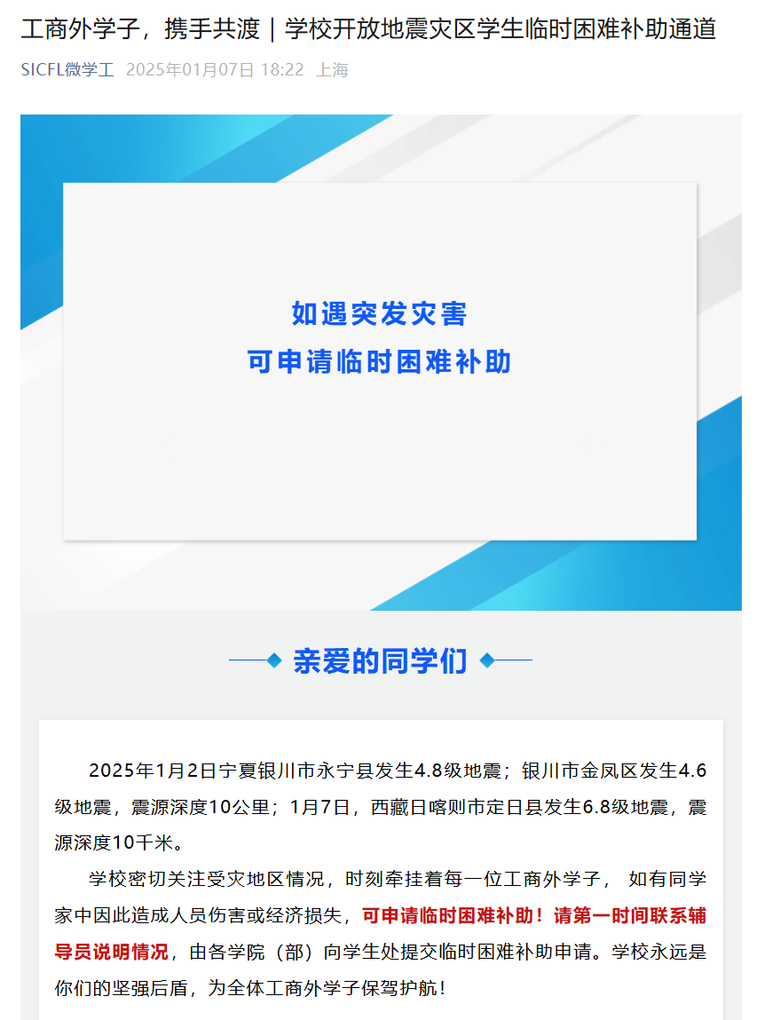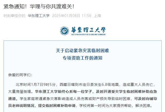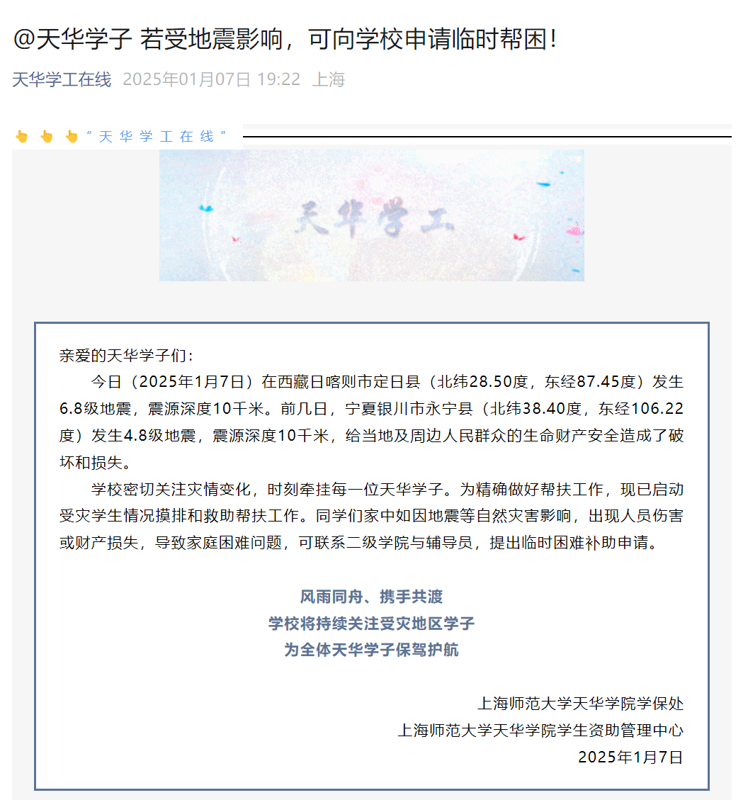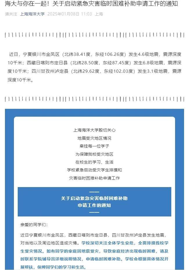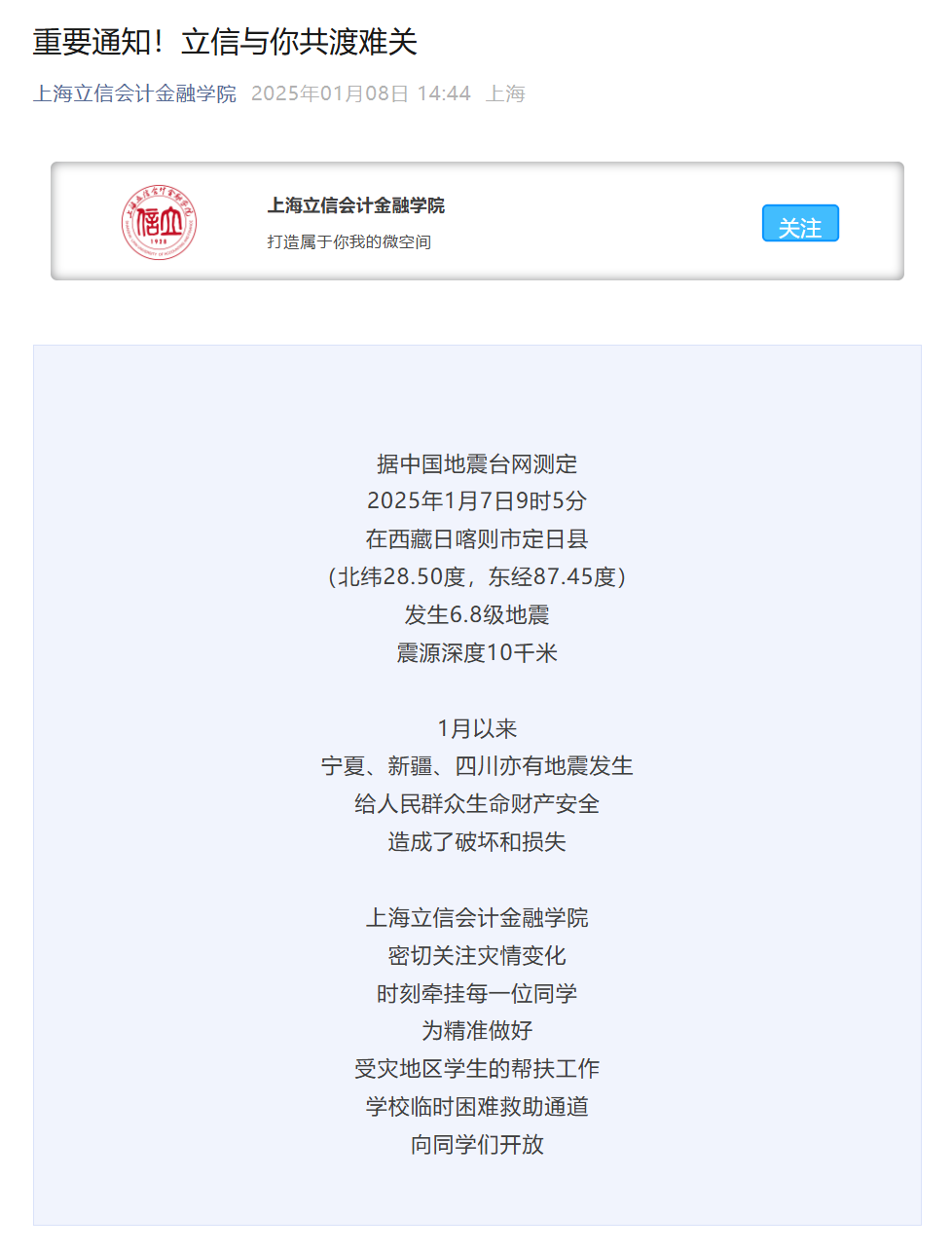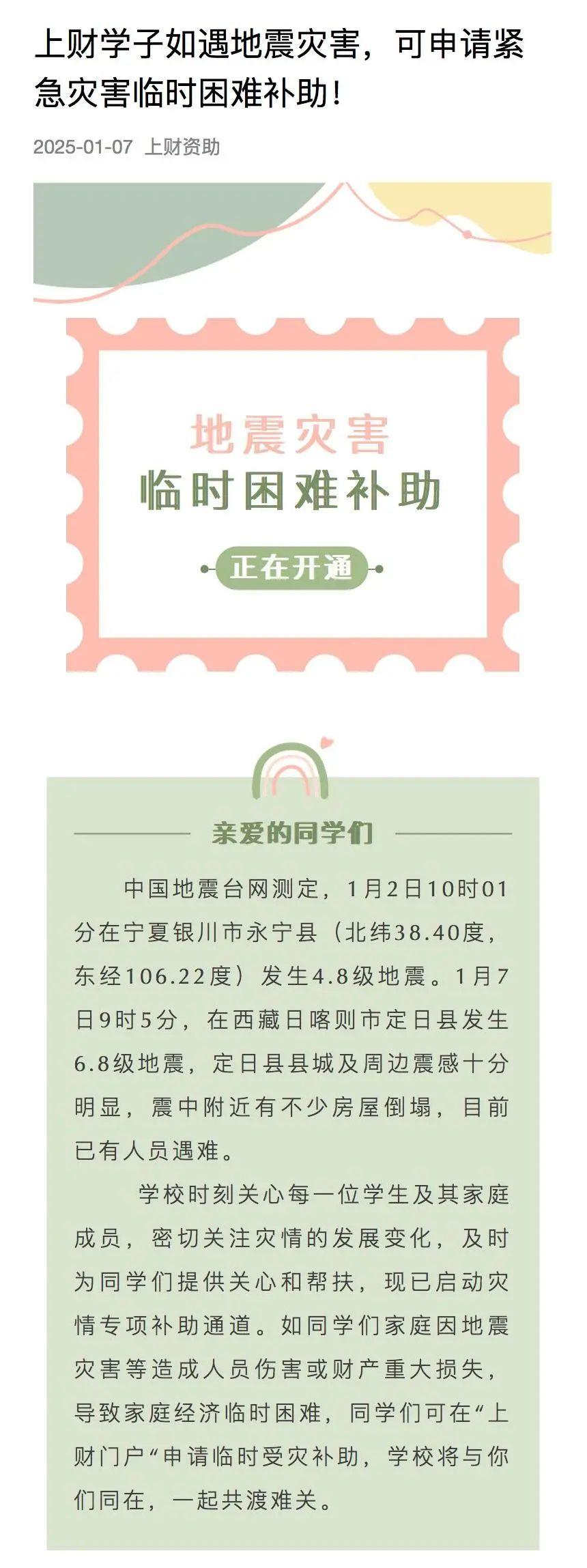 各高校还通过微信群等逐一排查反馈,确保受地震灾害影响的学生能及时获得相应帮助。