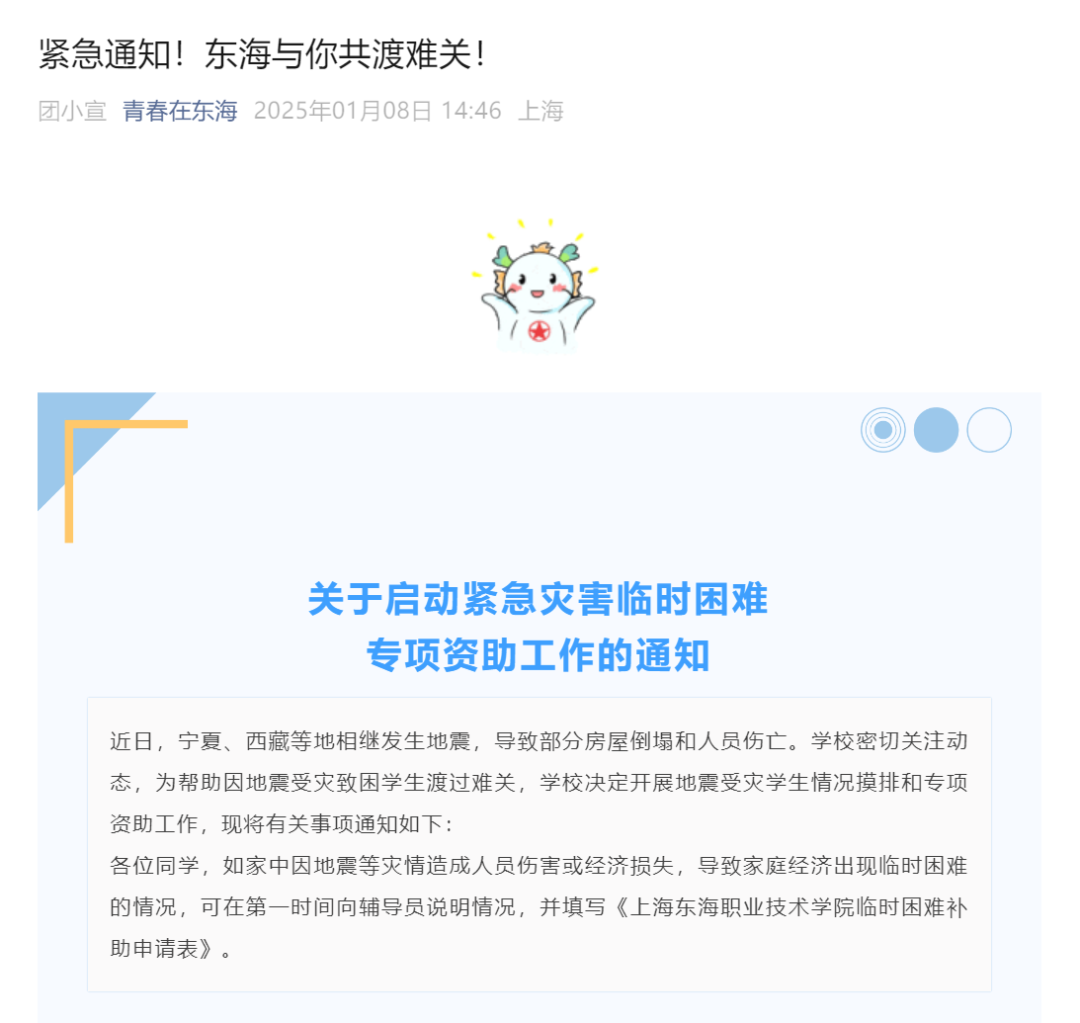 各高校通过官网、官微等渠道发布通知,开展地震受灾学生关心、摸排和应急资助工作。