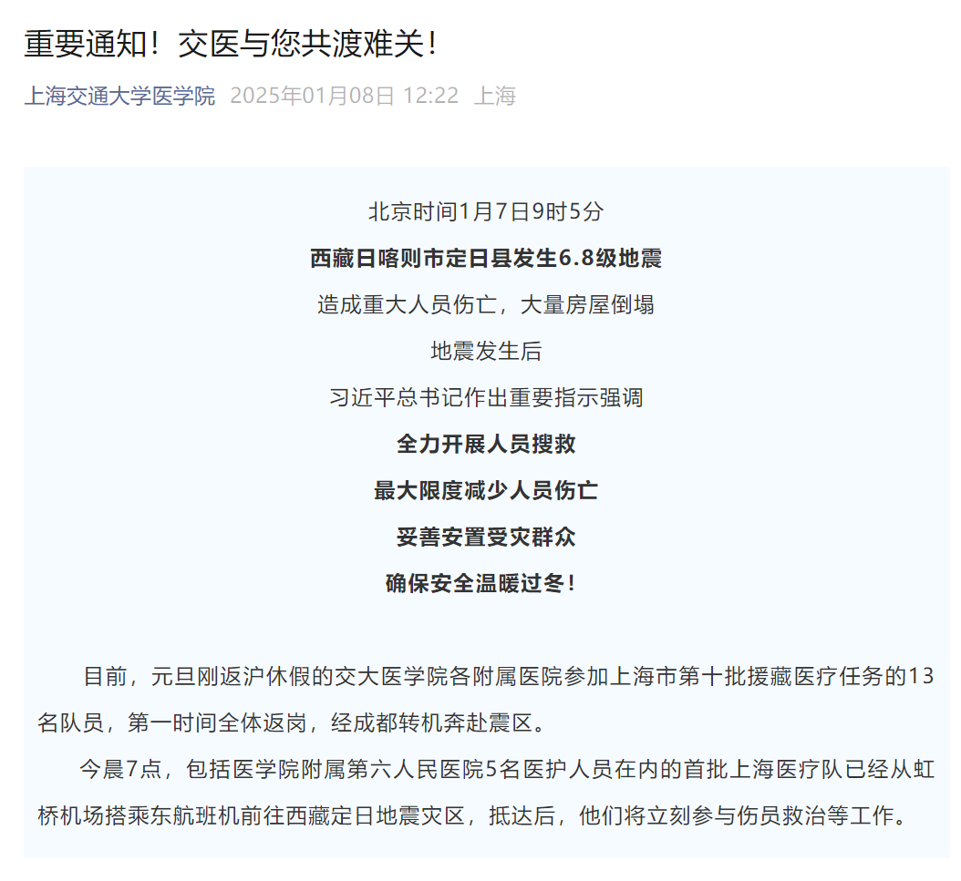近日,西藏日喀则市定日县等地发生地震,造成重大人员伤亡,大量房屋倒塌。
