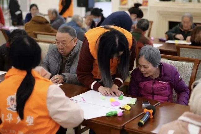 上海对外经贸大学“朝华夕塑”团队成员带领老人制作泥塑手工