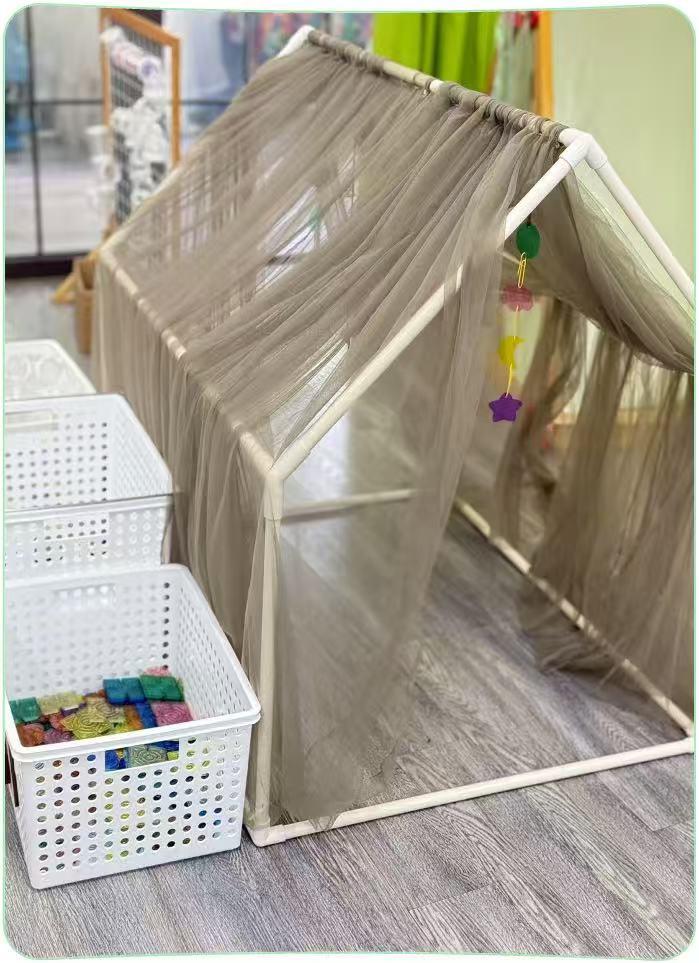 在黄浦区奥林幼儿园,特殊幼儿比例逐年上升。园长张颖介绍,幼儿园坚持“筛查-评估-干预-反馈”的闭环管理,让每个特需幼儿的成长都有迹可循。以自闭症谱系障碍幼儿晓今为例,学期初,幼儿园联合医疗团队开展基线评估,为她定制专属干预计划——用“名字魔法灯”“惊喜小袋寻宝”等趣味游戏,采用“高频短时”训练法,每次 3-5 分钟,一天多次开展,且在她有回应时即时给予正向奖励;同时,老师在教室里打造“感官友好安全角”,解决她坐姿不稳、喜欢随处躺的问题(下图)。