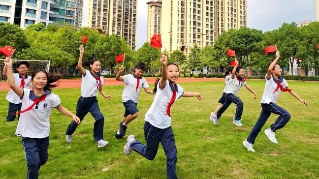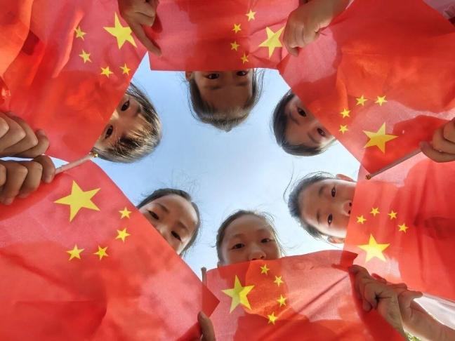 上海市宝山区鹿鸣学校开展“与国旗同框”主题活动,孩子们手持五星国旗,围成一圈,国旗的鲜红与蓝天相映。孩子们以这种充满创意的方式,传递出对祖国的深深热爱,尽显童真里的爱国情。