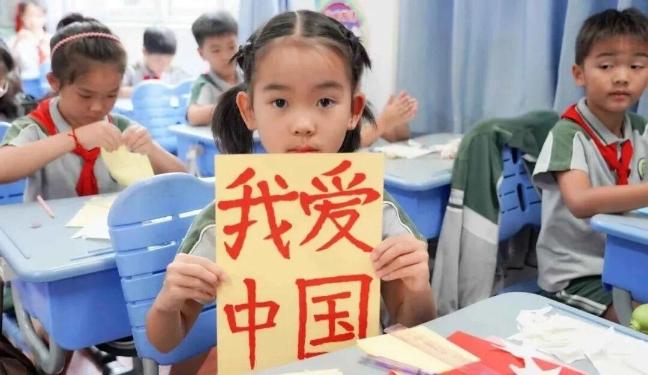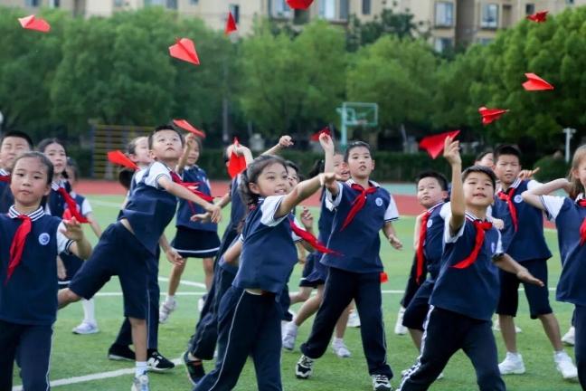 上海市闵行区七宝明强第二小学的孩子们用纯真的童心,喜迎国庆。在明媚的阳光下,同学们齐聚操场,将手中的红色纸飞机放飞向蓝天。每一架纸飞机,都承载着祖国的热爱与祝福,也寄托着对繁荣昌盛的美好期盼。