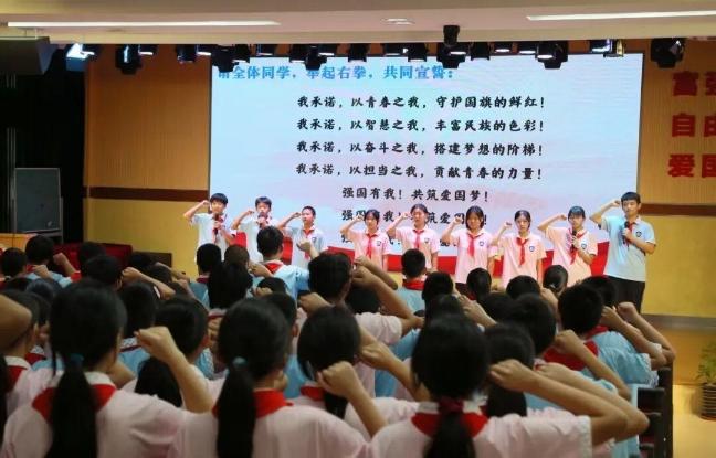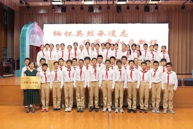 上海市徐汇中学举行“缅怀英烈承遗志,传承孝和启新程”烈士纪念日主题升旗仪式暨“王孝和中队”交接仪式,新“王孝和中队”八(7)中队代表许下传承诺言。