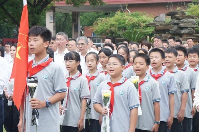 上海市奉贤区四团中学庄严举行烈士纪念日纪念活动。公祭仪式在赵天鹏烈士纪念塑像前举行,少先队员献唱《我们是共产主义接班人》,礼兵敬献花篮,全体人员依次瞻仰烈士塑像,表达深切缅怀与崇高敬意。