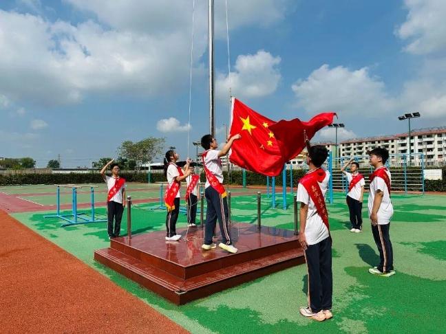 上海市金山区金山小学举行主题升旗仪式,师生共同合唱《我和我的祖国》,少先队员们满怀激情地挥舞着五星红旗,歌声与国旗飘扬交织,表达了师生对祖国的深深热爱与赤诚祝福。