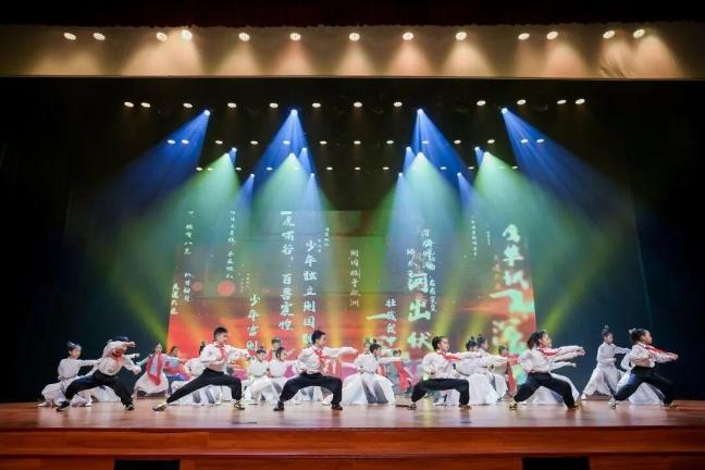 上海市青浦区崧泽学校学生与安徽天柱山革命老区的青少年共同主演的红色少儿武剧《传承》在赵巷影剧院上演,近200名小演员以武传情,融红色文化于表演,为祖国母亲送上祝福。