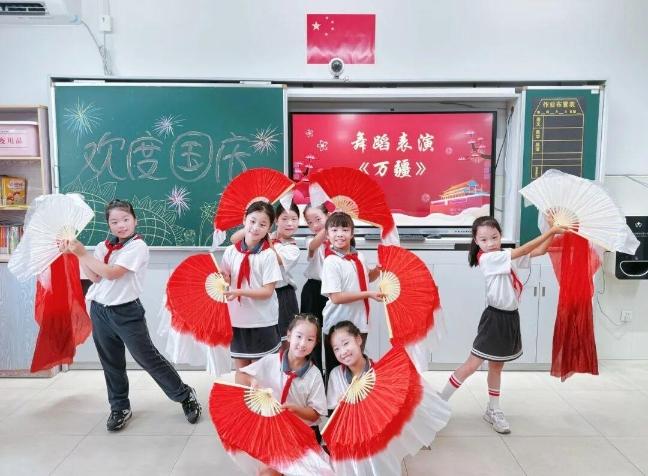 上海市宝山区月浦中心校组织各班精心开展主题班会。班会上,同学们手持中国红绸扇登场,伴着优美旋律,扇子开合似花绽,舞步流转如诗行,将深情融入每一个动作,展现对祖国的热爱与赤诚。