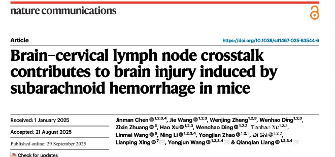 本网讯 (记者 程媛媛)近日,上海中医药大学脊柱病研究所梁倩倩研究员、王拥军教授(通讯作者)带领陈锦漫助理研究员(第一作者)等成员完成的重磅研究成果,以“Brain-cervical lymph node crosstalk contributes to brain injury induced by subarachnoid hemorrhage in mice”为题在国际权威期刊Nature Communications正式发表。这是上海中医大在中西医结合防治脑部重大疾病领域的又一突破性进展,标志着学校在中医理论现代化方向上再迈新台阶。