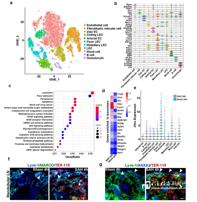 为精准解析脑—颈部淋巴结交互的分子机制,团队在中药功效成分发掘与利用全国重点实验室、筋骨理论与治法教育部重点实验室等平台支持下,构建自体血小脑延髓池注射、颈内动脉穿刺两种 SAH 小鼠模型,结合单细胞 RNA 测序、免疫荧光分析等前沿技术,展开深入研究并取得三项核心发现:锁定关键“病灶”:研究团队通过手术切除小鼠下颌淋巴结,发现两种模型的神经炎症与神经功能障碍均得到显著改善,这一结果明确证实下颌淋巴结在 SAH 后脑损伤过程中扮演着 “关键放大器”的角色;厘清降解路径:团队观察到,与 SAH 后 4 小时相比,下颌淋巴结内的血管外红细胞在 SAH 后 24 小时会发生降解,且被降解的红细胞碎片主要与颈部淋巴结的淋巴管内皮细胞(LEC)共定位。同时,体外研究进一步发现,淋巴管内皮细胞具备吞噬红细胞的能力,并能将其传递至溶酶体进行降解;找到核心靶点:对下颌淋巴结进行单细胞 RNA 测序(scRNA-seq)和免疫荧光分析后,团队发现 SAH 后 24 小时,血管外红细胞主要是被下颌下淋巴结髓窦 LEC 中的溶酶体蛋白酶 —— 蛋白酶 S(CTSS)降解。为验证 CTSS 的作用,团队使用 Prox1-creERT2; Ctssflox/flox 小鼠特异性清除淋巴结内皮细胞(LEC)中的 CTSS,或采用抑制剂阻断 CTSS 功能,结果显示两种方式均能显著减轻蛛网膜下腔出血(SAH)后的神经炎症,并有效改善神经功能缺损。