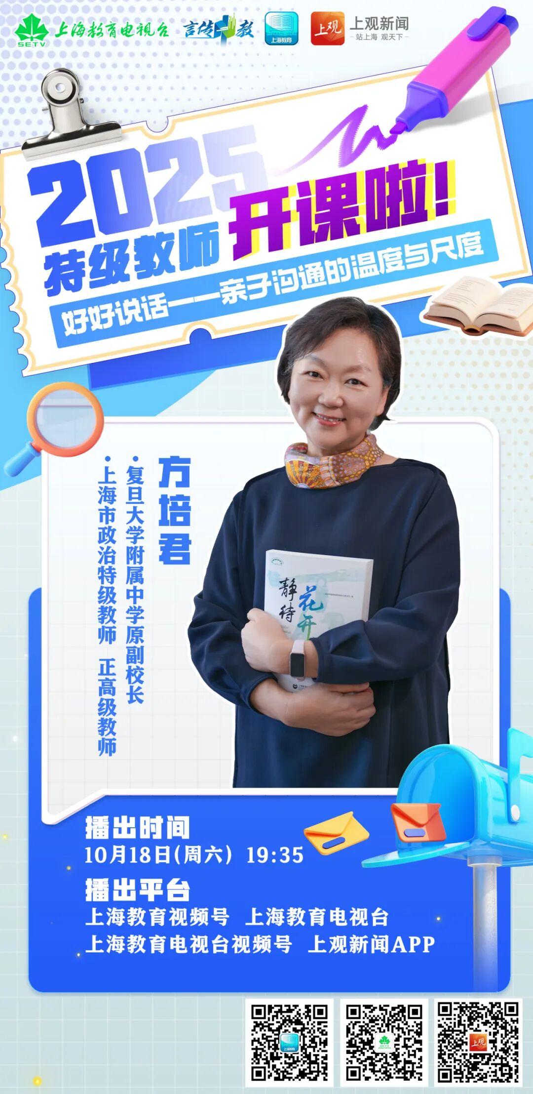10月18日(周六)19:35,2025年“特级教师开课啦”将在上海教育视频号、上海教育电视台、上海教育电视台视频号、上观新闻APP同步开播,每周一期。首场讲座由复旦大学附属中学原副校长,上海市政治特级教师方培君老师,和大家聊聊“好好说话——亲子沟通的温度与尺度”。
