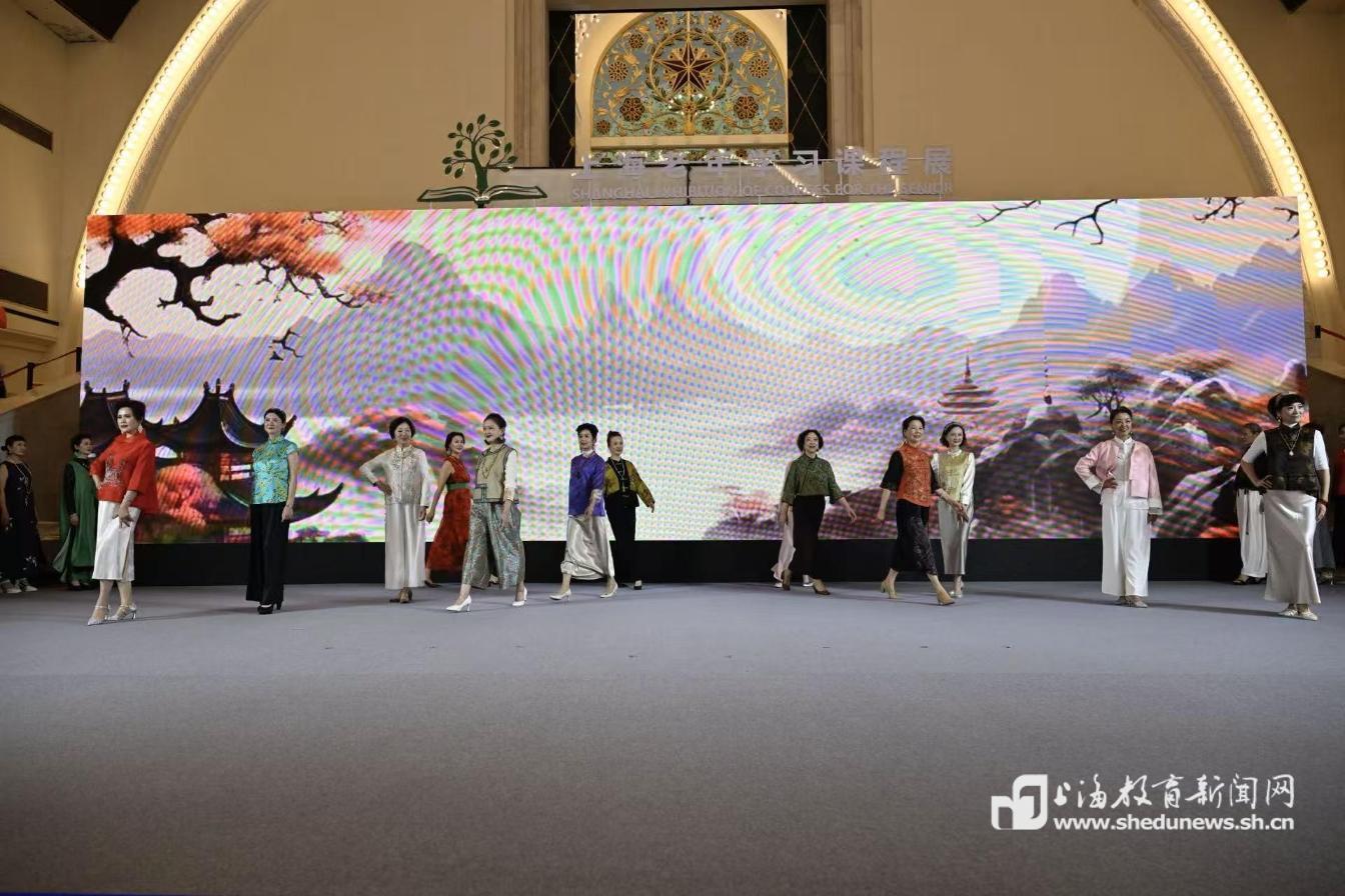 同期举办的上海市第十届九九重阳节“长者风范 天伦之乐”老年教育成果展演,在位于上海展览中心的中央大舞台3天内安排近百场展演,集中呈现上海老年教育的丰硕成果,生动演绎“学习之光 点亮金色年华”的展演主题。例如,上海老年大学带来时装表演《国风雅韵》,上海大学老年大学带来舞蹈《竹里编出幸福路》,青浦区老年大学带来朗诵《中国红》。东华大学老年大学带来特色服饰文化秀《锦绣中华》,所有服饰均经东华大学服装与艺术设计学院资深专家团队调研、设计、改良或制作。现场,上海老年大学的学员们还与孩子们共同表演歌舞、朗诵等节目,“金色年华”与“童真时光”交融的鲜活画面,彰显上海老年教育延伸至代际学习的良好风貌。