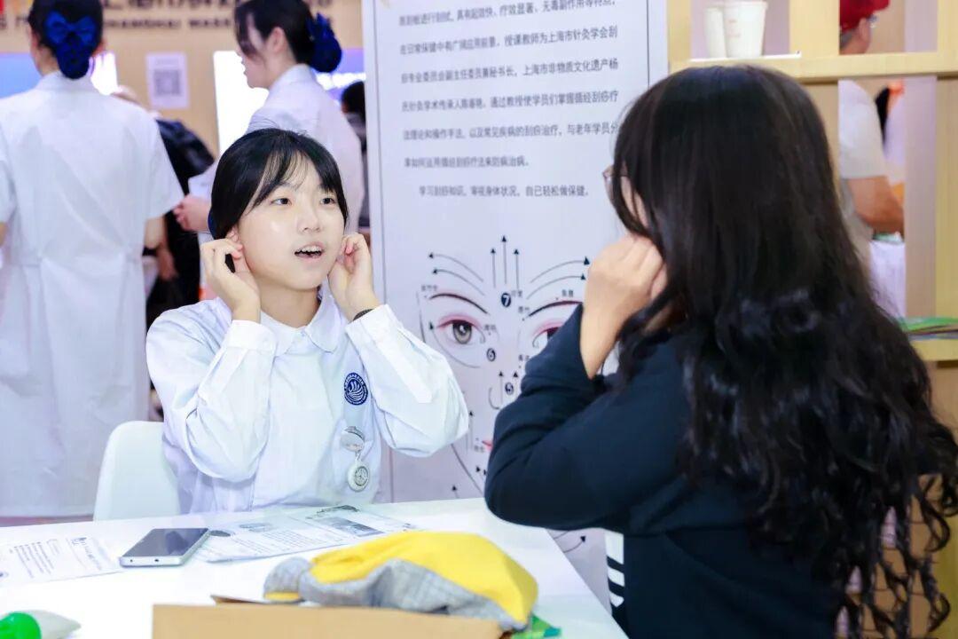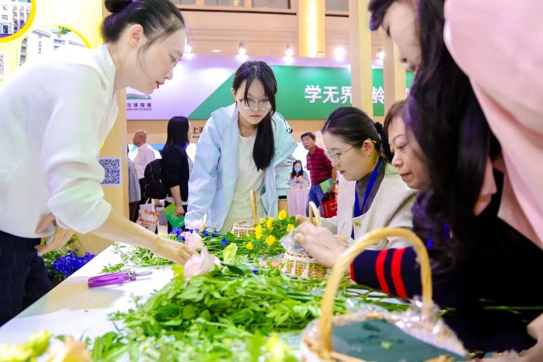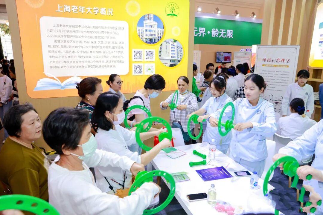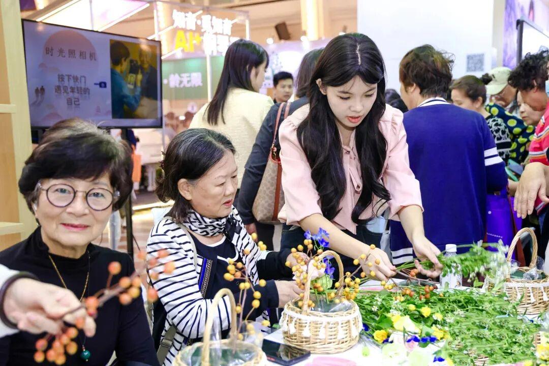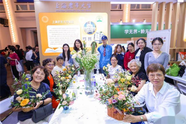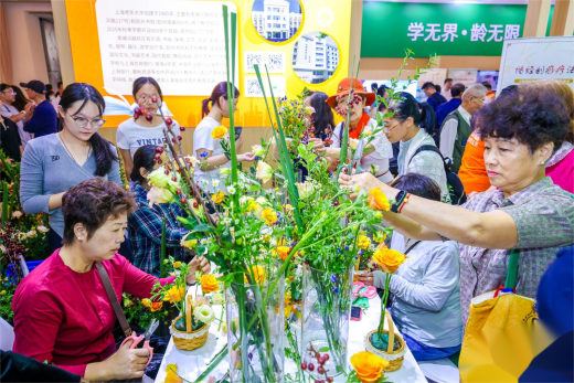 在上海老年大学展区,学校通过前沿科技体验与多主题互动课程,生动展现了老年教育提质扩容的新格局。尤为温馨的是,一系列以“大手牵小手 银发暖童心”为主题的互动课程——如花艺制作与健康护理,吸引了众多观众参与。现场的长者们与来自上海建设管理职业技术学院、上海南湖职业技术学院的学生们结对协作,共同体验。长者们耐心传授人生智慧,青年学子则热情展示现代技能,彼此在互动中教学相长,笑语融融,不仅让整个展区洋溢着收获的喜悦与代际间的温暖,更体现了老年教育与职业教育融合创新的实践成果。