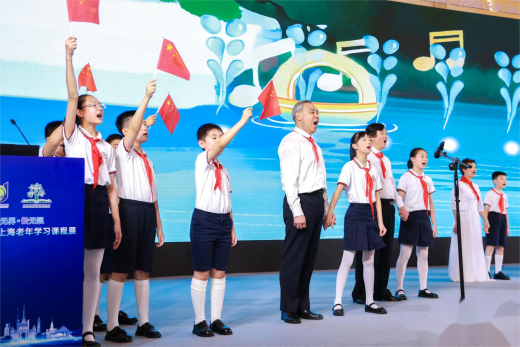 “老少同乐·共筑舞台”环节成为本次展演中最动人的亮点。启动仪式上,上海市教育发展基金会副理事长蒋红,上海市老干部大学校长周鸿刚等领导与上海市长宁区愚园路第一小学的学生代表共同启动了寓意“滋养成长、静待花开”的浇花装置,象征着老年教育与青少年教育的交融与传承。