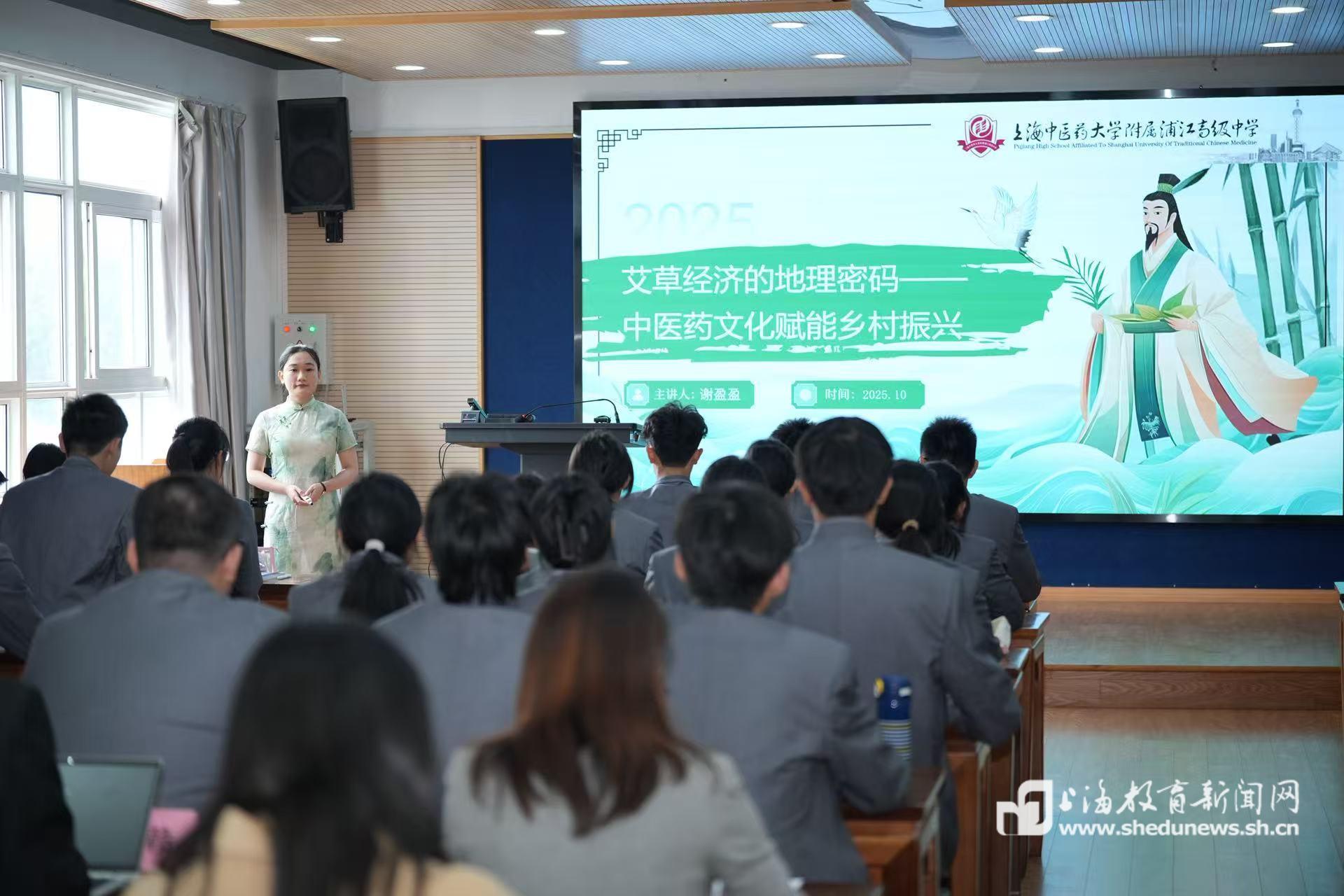 下午的经验交流环节紧扣中小学阶段中医药科创教育的创新实践,上海中医药大学附属浦江高级中学校长张乐介绍浦江高级中学的中医药特色教育体系,并希望中小学教师树立跨学科教学思维,从中医药文化传承者转变为中医药文化教学的开拓者。浦江高级中学谢盈盈老师以问题链的形式对艾草这一特色农业带动乡村振兴的致富密码进行层层解析。在讲课中,她引导学生深入思考、参与问题作答,掌握跨学科知识,培养学生信息获取能力、区域认知和综合思维。