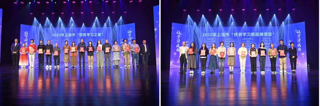开幕式现场,主办方为获得上海市2025年“终身学习品牌项目”“百姓学习之星”等殊荣的代表颁发证书。