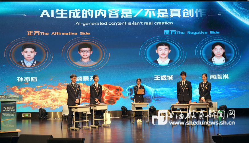 高中部的英语辩论展示则将活动推向另一个高潮。高二学生围绕“AI生成的内容是/不是真创作”展开激烈辩论。正方认为,AI是人类意图的延伸,其产物在审美与创意上具备“真创作”的价值;反方则坚持,缺乏情感与意识的AI只是模仿与重组,无法承载创作的灵魂。双方引经据典、妙语连珠,既有对技术边界的追问,也有对人文精神的坚守。这场辩论不仅展示了学生们的思辨能力与语言表达能力,更引发了全场对AI时代教育创新的深刻思考。