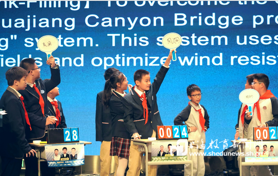 初中部“一站到底”时事争霸赛也让现场的观众眼前一亮,来自上实教育集团的8支初中代表队围绕科学、AI素养等深刻议题展开了激烈角逐。孩子们不仅展现了自己广泛的知识储备、敏锐的思维洞察力,还通过团队合作展现了出色的沟通与协作能力。经过多轮激烈角逐,最终上海市实验学校中一战队脱颖而出,捧走特等奖奖杯。