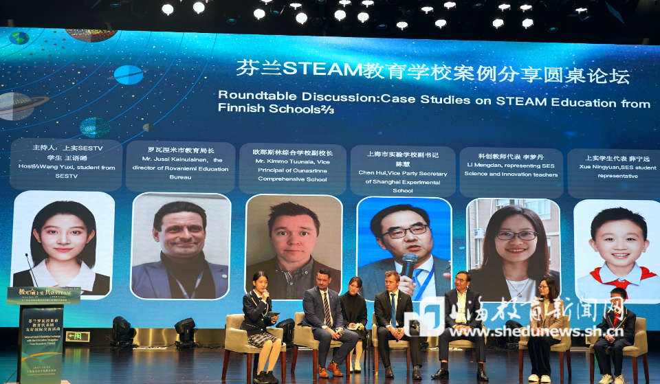 当天,围绕 STEAM 教育的价值、课程融合、评估方式、AI 时代的教师角色和教育收获等议题,芬兰罗瓦涅米市教育局局长 Jussi Kainulainen 先生、芬兰校长代表 Kimmo Tuunala 先生、上海市实验学校党委副书记陈慧、科创教师李梦丹及学生代表薛宁远展开深入对话,本场沙龙由上实学生电视台台长王语晞主持。