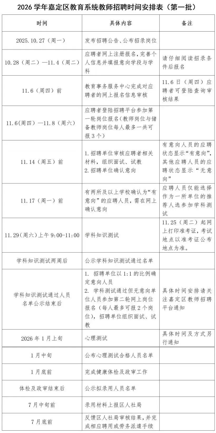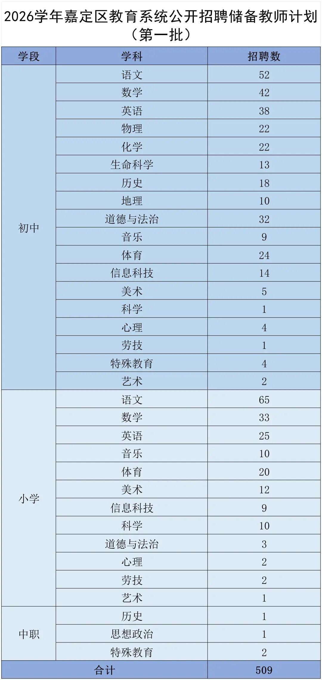 根据相关文件精神,为加强师资力量,建设一支高素质、专业化的师资队伍,嘉定区教育系统将面向社会公开招聘教师。2026学年第一批计划招聘事业编制教师488名、储备教师509名。