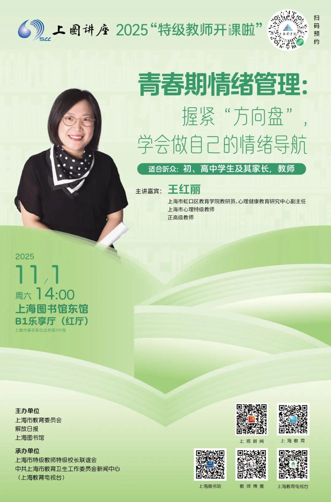 由上海市教育委员会、解放日报、上海图书馆主办,上海市特级教师特级校长联谊会、中共上海市教育卫生工作委员会新闻中心(上海教育电视台)承办的2025年“特级教师开课啦”于8月至11月的周六,以线下系列讲座的形式在上海图书馆举行。