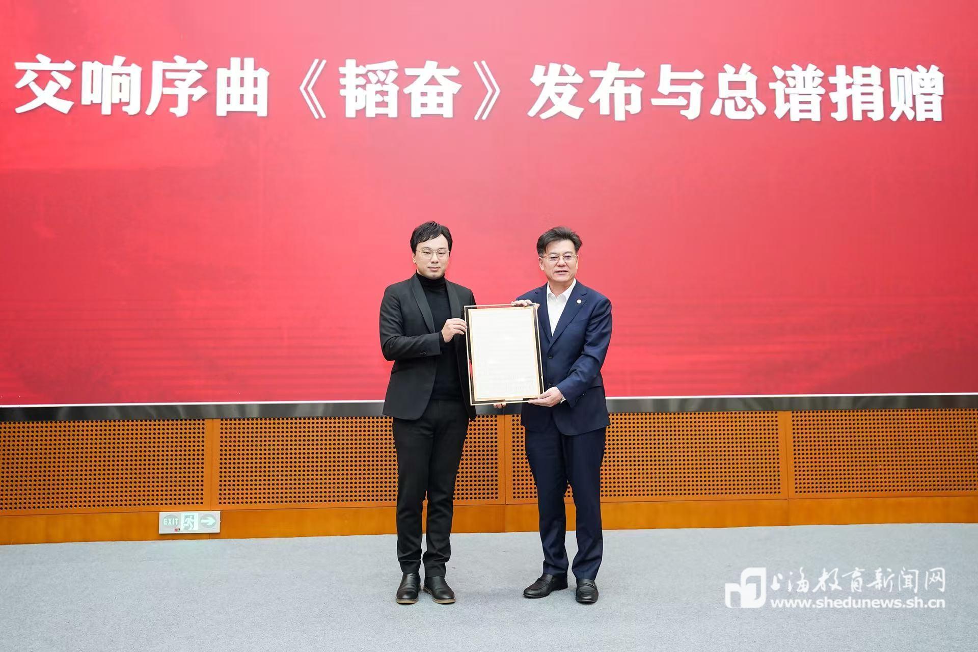 纪念大会上,多项重要成果相继发布。为纪念邹韬奋先生,青年作曲家罗威谱写了交响序曲《韬奋》,以旋律致敬先贤;青年歌唱家张帆涛用歌声演绎韬奋先生信仰的力量与光芒。这份凝结着敬意与才华的作品,其总谱正式捐赠给上海交大,为传承韬奋精神增添了鲜活艺术载体。