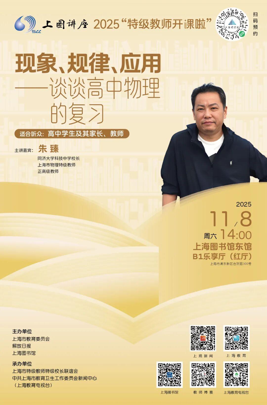 由上海市教育委员会、解放日报、上海图书馆主办,上海市特级教师特级校长联谊会、中共上海市教育卫生工作委员会新闻中心(上海教育电视台)承办的2025年“特级教师开课啦”于8月至11月的周六,以线下系列讲座的形式在上海图书馆举行。