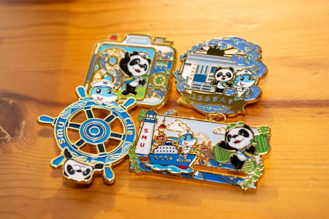 在后勤保障方面,学校为“小叶子”精心设计了志愿者物资包,包括实用与颜值兼具的进博主题双肩包和印有“进宝”与“小海狮”的颈枕。同时,一套以“海魂”为主题的系列徽章尤为亮眼,画有校船“育明轮”的徽章以巧妙的滑动设计寓意破浪前行、勇毅探索;“共掌舵轮”徽章以“进宝”和“小海狮”共同紧握舵轮的设计,象征团结协作、共同进步;“博海情谊”徽章让“进宝”和“小海狮”在学校中远图书馆前亲密同框,承载深厚情谊。
