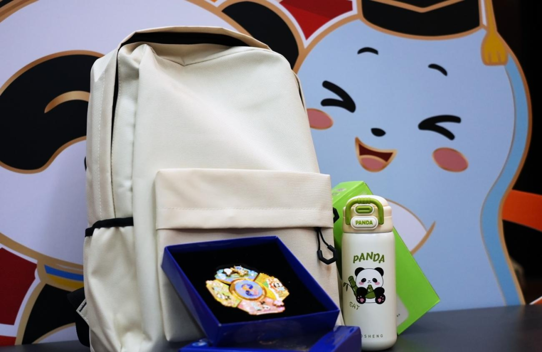 同时,学校为“小叶子”们定制了特色物资包传递匠心温度,其中珐琅工艺徽章成为亮点。徽章以传统祥云纹为灵感,重构纹样韵律,从敦煌壁画、古瓷器等文物中提取细节与色彩,金色主调彰显庄重,“七彩祥云”配色增添活力,实现传统与现代的碰撞,传递吉祥顺遂的美好愿景。此外,还配套充电宝、收纳包等实用物资,既提供贴心保障,更以文创载体向世界传递中华优秀传统文化魅力。