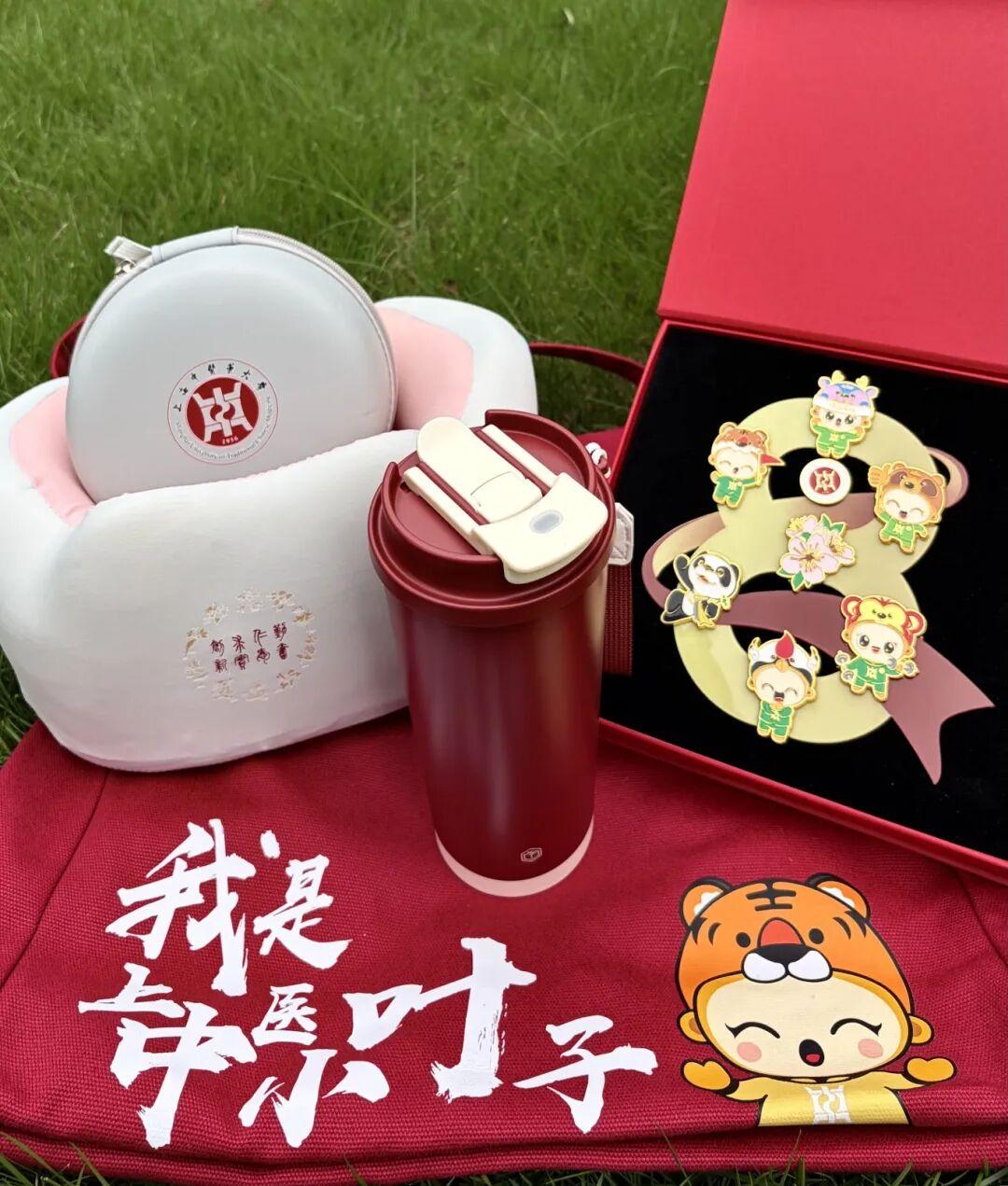 此外,学校在物资保障与文化激励上同步发力,为“小叶子”定制特色装备,包括本届进博会限定版帆布袋、学校特色进博徽章、柔软的U形头枕以及温暖的保温杯等。其中,此次特色进博徽章以“8字形”串联进博会吉祥物“进宝”、学校吉祥物“申小杏”、杏花与校徽。整套徽章既呼应第八届进博会主题,更蕴含“千年岐黄焕新姿”的深意。在“四叶草”与“杏花”的交相辉映中,上中医的“小叶子”成为文化传递的使者,将以“青春之我”让传统中医药文化在进博舞台绽放光彩。
