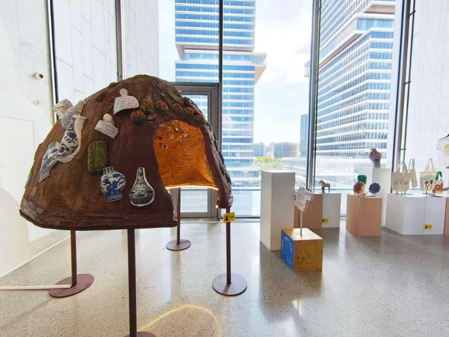 在上海博物馆东馆古代文明探索宫门口,“桃娃探宝秘洞”艺术集创作品前围满了游客。这件由近20组桃浦亲子家庭共同创作的装置,以“国宝探索”为主题,融合青铜器纹样、陶俑造型等元素,用黏土、拼贴等形式呈现,被观众称为“会讲故事的亲子艺术展”。这一装置诞生于上海博物馆的博观大课堂 “国宝探索记” 美育计划。中国青少年宫协会阅读推广专委会副秘书长、一级播音员卢灼华老师和备受桃浦社区家庭喜爱的艺仓美术馆儿童公共教育项目签约课程导师高俊清老师,携手组建 “社区大咖助力团”,带领桃浦社区青少年及家庭参与 “国宝探索记” 的 “小小讲解员” 与 “小小创意家” 两大活动项目。在 “小小讲解员” 项目中,卢灼华老师凭借深厚的语言传播功底与青少年教育经验,为孩子们提供专业指导。经过层层选拔,来自桃浦的2名学生一路过关斩将,最终荣获 “国宝探索记” 十佳 “小小讲解员”,展现了桃浦青少年在语言表达与文化理解方面的出色能力。而在 “小小创意家” 项目里,高俊清老师则带领近20组社区亲子家庭开启了一场艺术创作之旅。她以 “国宝探索” 为灵感,引导家长与孩子共同观察文物的造型、色彩与纹样,鼓励大家结合自身对传统文化的理解,发挥想象力进行艺术创作。这些作品最终汇聚成 “桃娃探宝秘洞” 艺术集创作品,并“走”进了上海博物馆(东馆)。