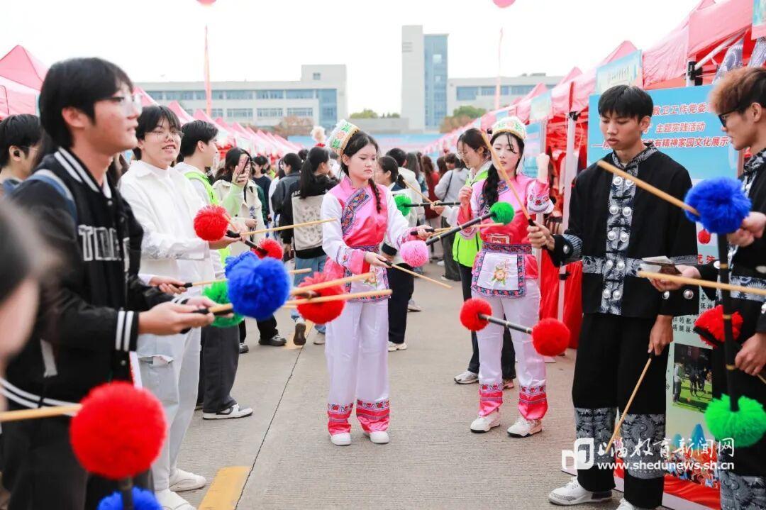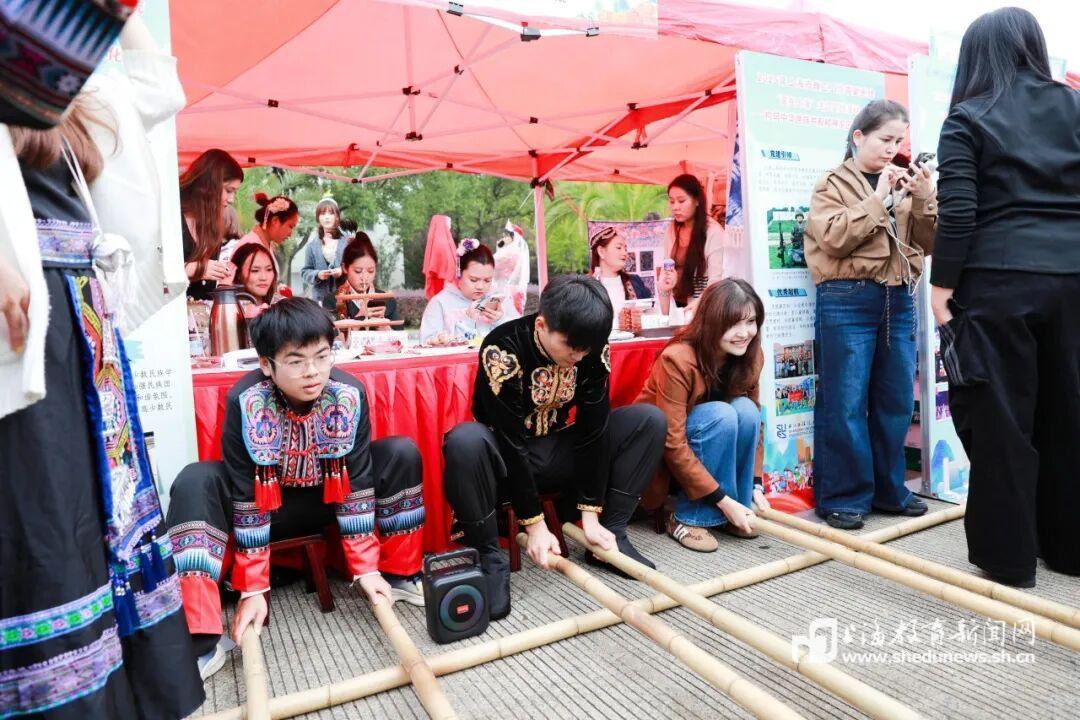 在民族特色文化展示和民族游戏互动体验区,各高校以“民族村”的形式展示民俗文化、民族风情,每个帐篷前都挂起了民族特色饰品、展示了民族游戏活动,吸引了大批学生驻足并参与体验,让学生在视听盛宴中体验了民族风情。在海派文化展示与体验区,上海国家级非物质文化遗产——剪纸、芦苇画、绒绣等,展现了海派文化的独特魅力,让现场的师生沉浸式地感受了上海非遗的传统文化之美。