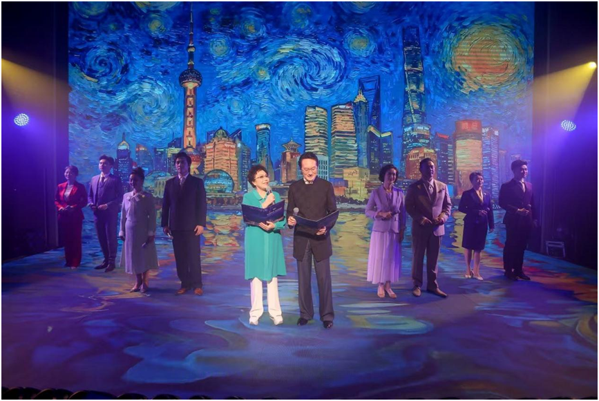 美轮美奂的诗歌朗诵是每年观众最期盼的重头戏。晚上七点整,剧场内灯光渐暗,一束追光洒向舞台中央。朗诵艺术家刘家祯与上海体育大学学生李千并肩而立,以深沉而激越的声音,共同演绎屈原的《九章·涉江》。千年楚辞的苍茫悲壮与当代青年的清朗声线交织,瞬间将舞台带入跨越时空的文学长河。紧接着,清溪诗社成员吟诵起《江南园子里的暗香》,诗句中氤氲的桂花、青苔与旧墙,让整个剧场仿佛都浸润在江南烟雨的温润之中,令人沉醉。