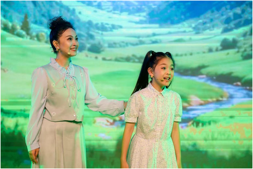 “亲爱的老师,那一天,你拍拍我的肩膀,说‘错了也没关系’,于是我擦掉眼泪,橡皮屑也开出小花。那一天,您对我眨眨眼,夸我‘想法真奇妙’,只因为我画了顶会飞的蘑菇伞。”舞台中央,虹口区广中路小学四年级女孩肖涵珺用活泼悦耳的声音,与她的老师和同学们共同演绎着她创作的、获得此次上海市民诗歌节原创作品征文一等奖的诗歌《那一天》。他们台风稳健,配合默契,在可爱童趣的舞台画面映衬下,迅速带领观众走进美好而温暖的校园生活。