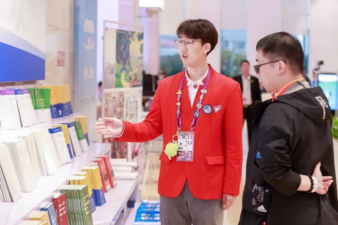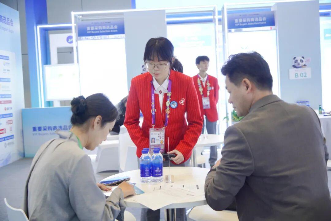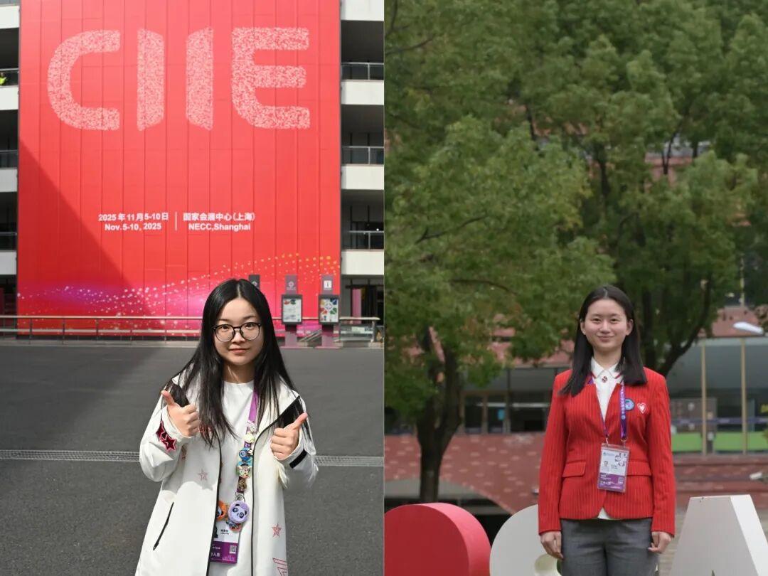 来自上海科技大学的“小叶子”潘雨卓与杨茜雯,共同服务于农食产品展区,是彼此在忙碌中温暖的依靠。面对川流不息的观众,两人形成了自然的默契:一个眼神便能会意支援,一句提醒就能防范疏漏。当潘雨嗓音开始沙哑,杨茜雯便会适时递上温水;当杨茜雯应对多线询问时,潘雨卓也会主动上前分担。这种无需言说的支持,让志愿服务的旅程充满了温暖与力量。