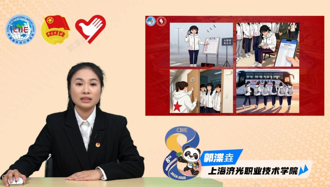 上海济光职业技术学院的郭渫垚是一名二年级“小叶子”,今年她投身辅助管理岗,将此前服务进博会的统筹经验融入人员调配、后勤支持、临时顶岗等工作中。此外,她还受邀参与第八届进博会优秀志愿者岗位经验分享的录制,把自身沉淀的服务心得与实践技巧转化为助力同伴成长的力量。