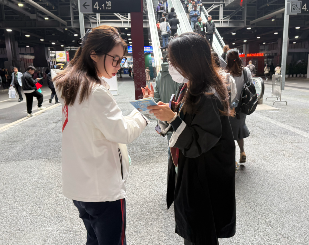 上海海洋大学外国语学院2025级“小叶子”杨婕发挥英语专业优势,为外国客商提供清晰指引。为更好地服务来自不同文化背景的客商,她提前熟悉相关知识,协助对接专属服务,以实际行动践行着“奉献、友爱、互助、进步”的志愿精神。