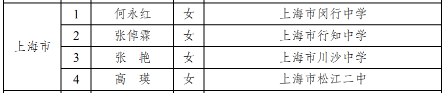 入选的这4名教师分别是,上海市闵行中学何永红、上海市行知中学张倬霖、上海市川沙中学张艳、上海市松江二中高瑛。